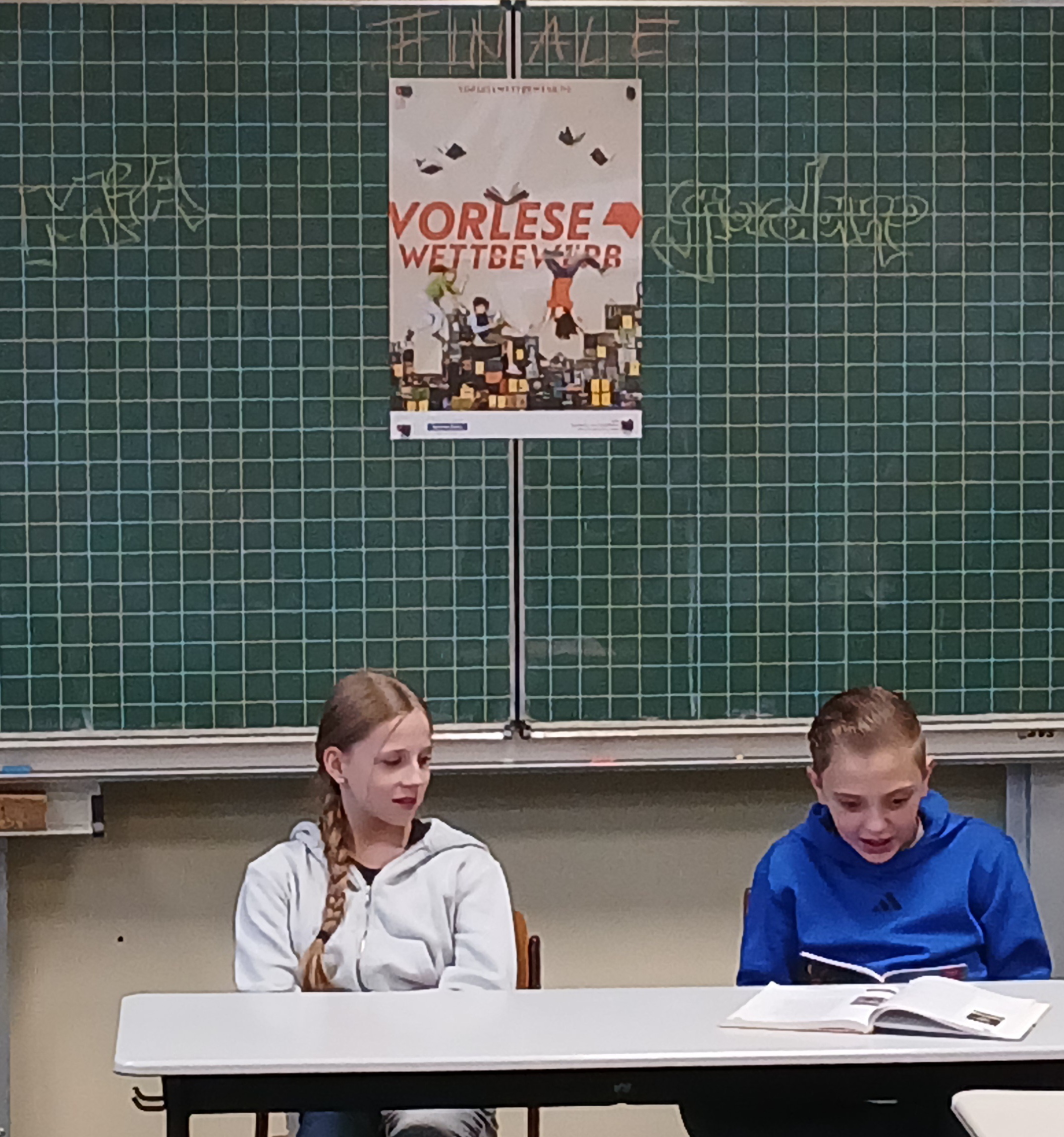 Beim diesjährigen Lesewettbewerb der 6. Klassen der Schillerschule setzte sich Mia aus der 6a im spannenden Finale gegen Giordano aus der 6b durch. Beide hatten zuvor ihre Klassenentscheide gewonnen und traten nun vor den versammelten Parallelklassen gegeneinander an.