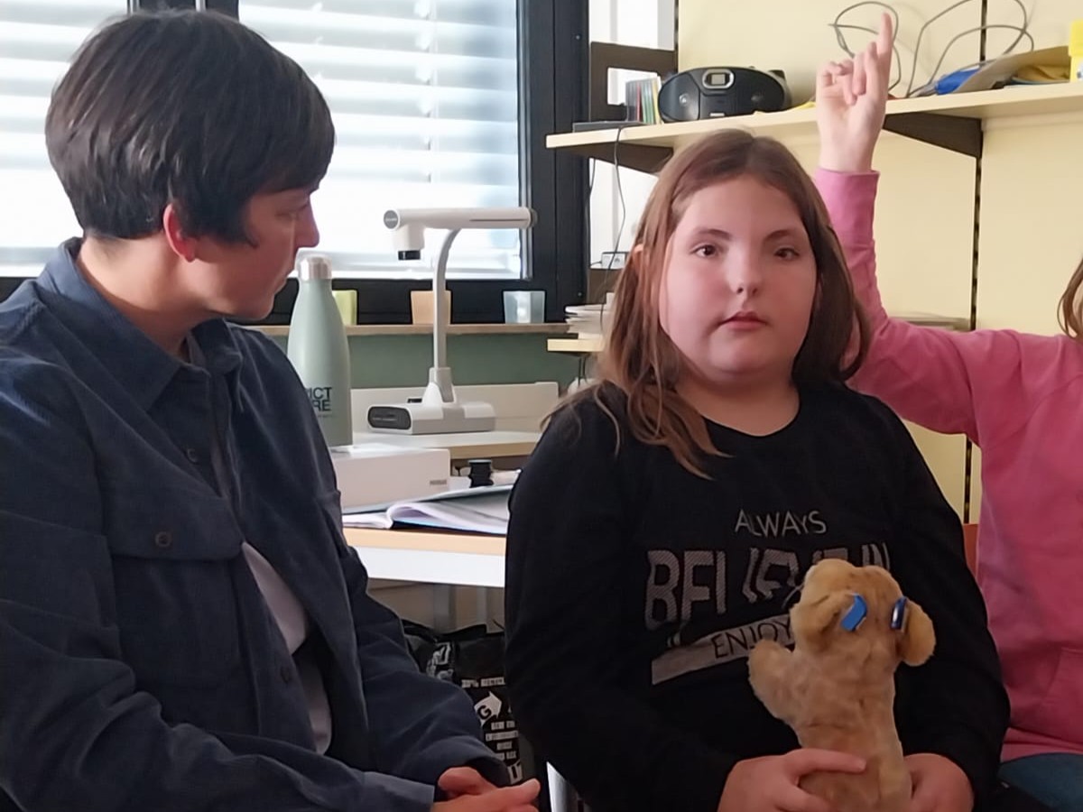 Am Dienstag war ich richtig aufgeregt, denn ich durfte die Klasse 4 besuchen! Zusammen mit Frau Bär und Herrn Moosmann – die beide Sonderschullehrkräfte des SBBZ Hören in Heiligenbronn sind – bin ich für eine ganze Doppelstunde in euer Klassenzimmer gekommen. Ich selbst trage ja Hörgeräte und ich wollte euch zeigen, wie spannend, lustig und manchmal ganz schön schwierig das Hören damit sein kann.
